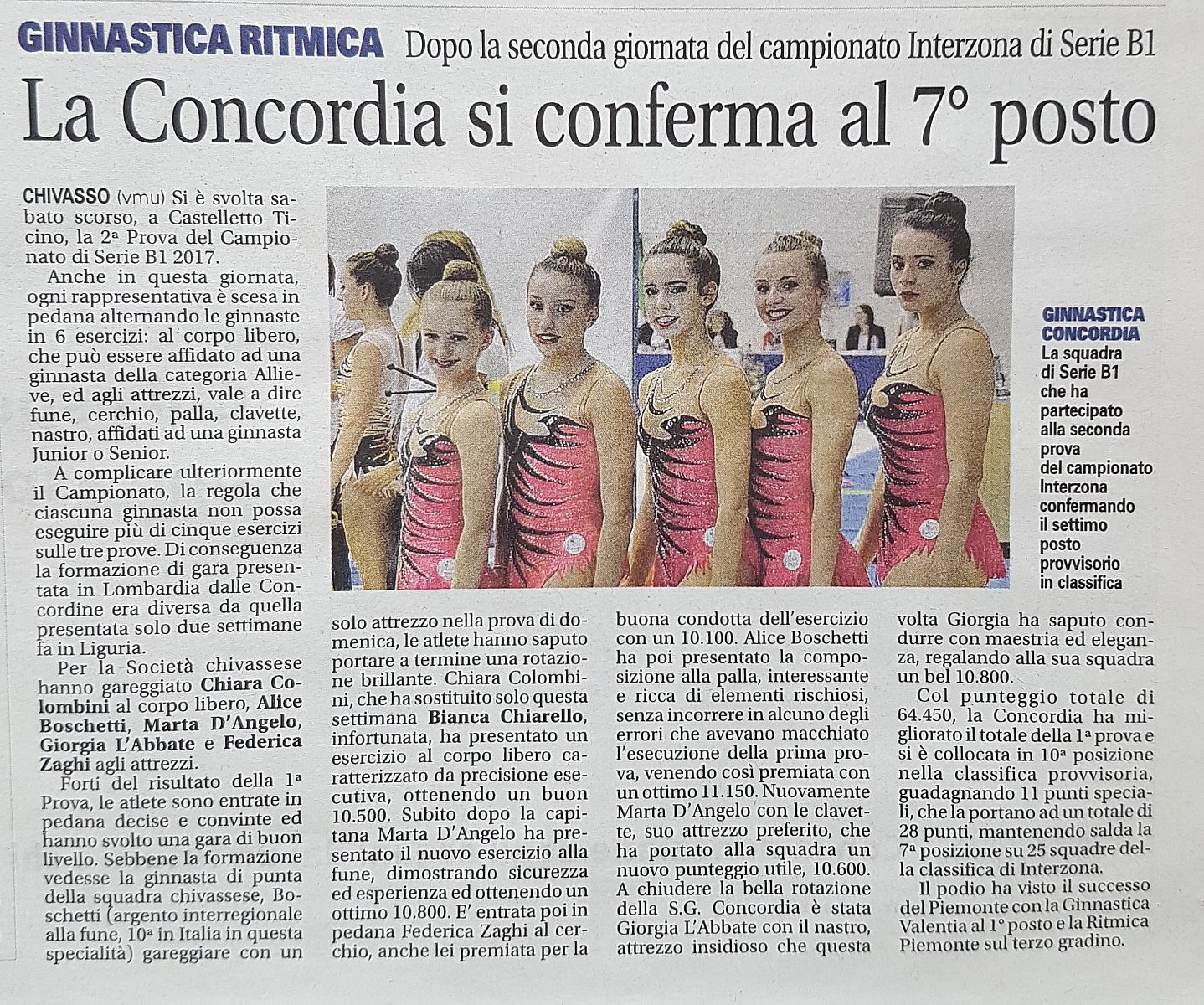 Castelletto Ticino, sabato 21 ottobre: la S.G. Concordia è in pedana per la 2^ Prova del Campionato di Serie B1, Zona Tecnica 1, vale a dire le ginnaste provenienti dal Piemonte, dalla Valle d'Aosta e dalla Liguria. Venticinque le squadre partecipanti, come nella 1^ Prova: 17 dal Piemonte, 1 dalla Valle d'Aosta, 7 dalla Liguria. Venticinque squadre molto determinate, con ginnaste preparate, tese a fare il meglio per risalire la classifica il più possibile. Soltanto una fra tutte, la prima classificata al termine delle tre prove, conquisterà l'ambito pass per