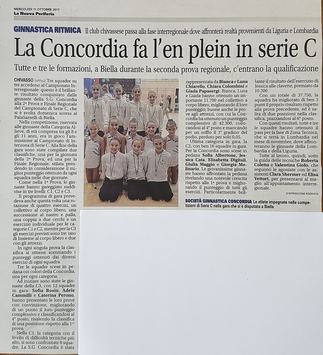 Tre squadre in gara, tre pass per gli Interregionali: è stato questo il brillante risultato ottenuto domenica scorsa dalle ginnaste della Concordia, sulla pedana del PalaSarselli di Biella, nella 2^ Prova del campionato Regionale di Serie C, riservato alle ginnaste della categoria Allieve. Come nella 1^ Prova, tre sono state le categorie di gara: la C1, la C2, la C3. Obiettivo, per tutte, l'ammissione alla fase interregionale, riservata all'80% delle partecipanti. Il via l'hanno dato le ginnaste della C2, dove le squadre in gara erano 12. Per la Concordia