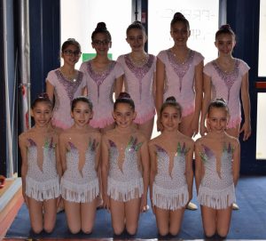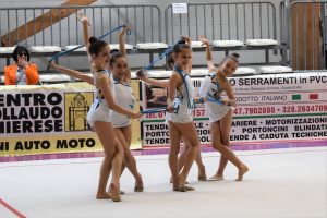 La prima a scendere in pedana è la squadra B, formata dalle ginnaste più giovani: Carolina Capriolo, Arianna Demedici, Sofia Di Sanzo, Giulia Fisanotti e Francesca Picco. Per alcune di loro questa è la prima volta di una gara di squadra, gara molto impegnativa che richiede, oltre a sicurezza nel maneggio degli attrezzi, una buona intesa con le compagne. Le giovani ginnaste eseguono l’esercizio con 5 cerchi, affrontando con impegno questa prova importante e piazzandosi all’8° posto.