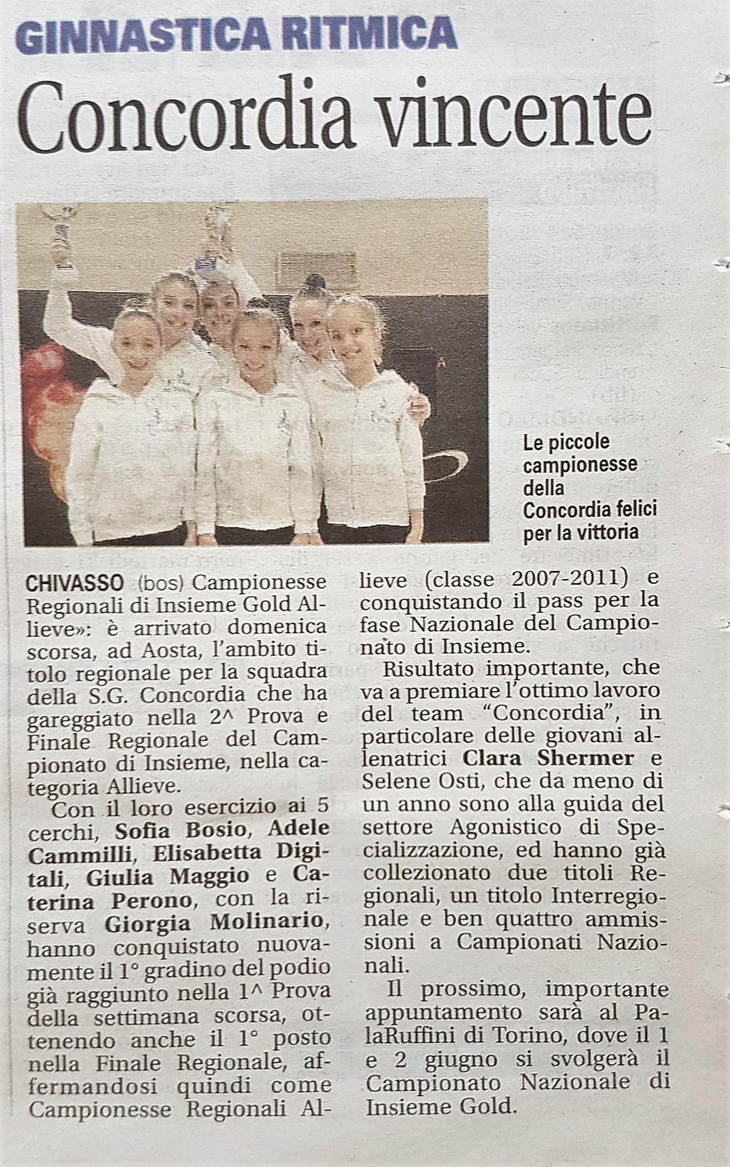 Sabato prossimo, sulla prestigiosa pedana del Palaruffini di Torino, si svolgerà il Campionato Nazionale di Insieme Gold 2019, a cui parteciperanno le migliori squadre provenienti da tutta Italia, divise nelle categorie Allieve, Giovanile ed Open. La S.G. Concordia sarà in gara nella categoria Allieve, con l'esercizio ai 5 cerchi, con il quale nella fase Regionale ha conquistato il 1° posto ed il Titolo Regionale. Ancora una volta, saranno in pedana per questo importante appuntamento, le nostre "Farfalline": Sofia Bosio, Adele Cammilli, Elisabetta Digitali, Giulia Maggio, Giorgia Molinario e Caterina Perono, guidate dalle