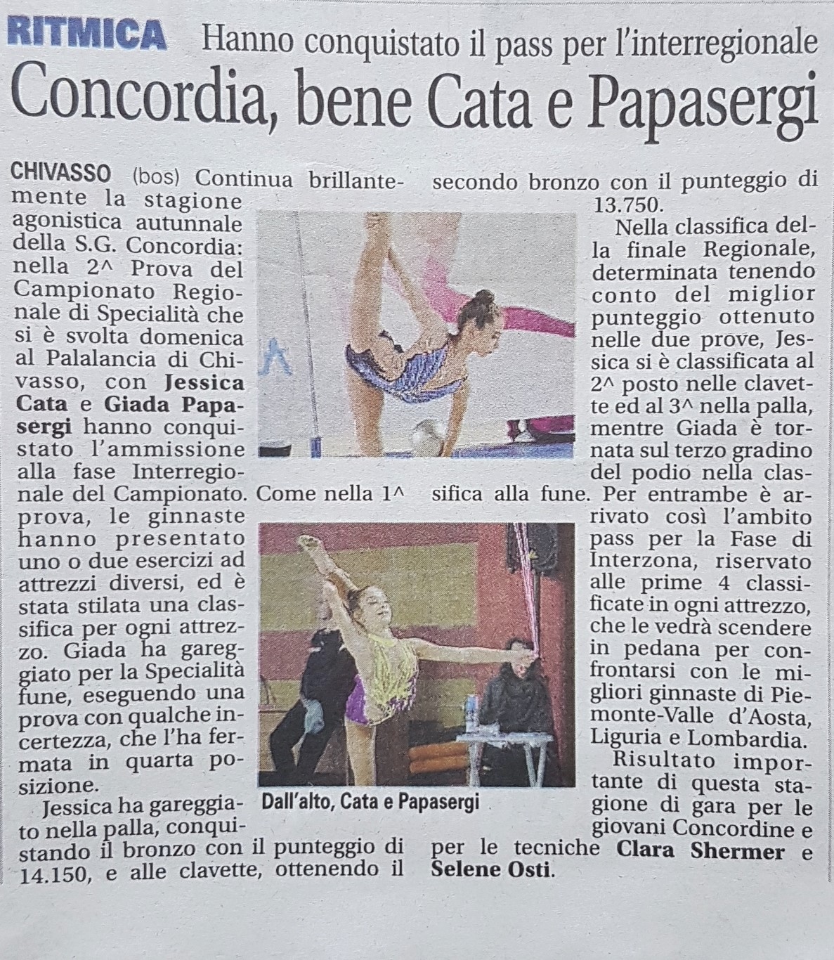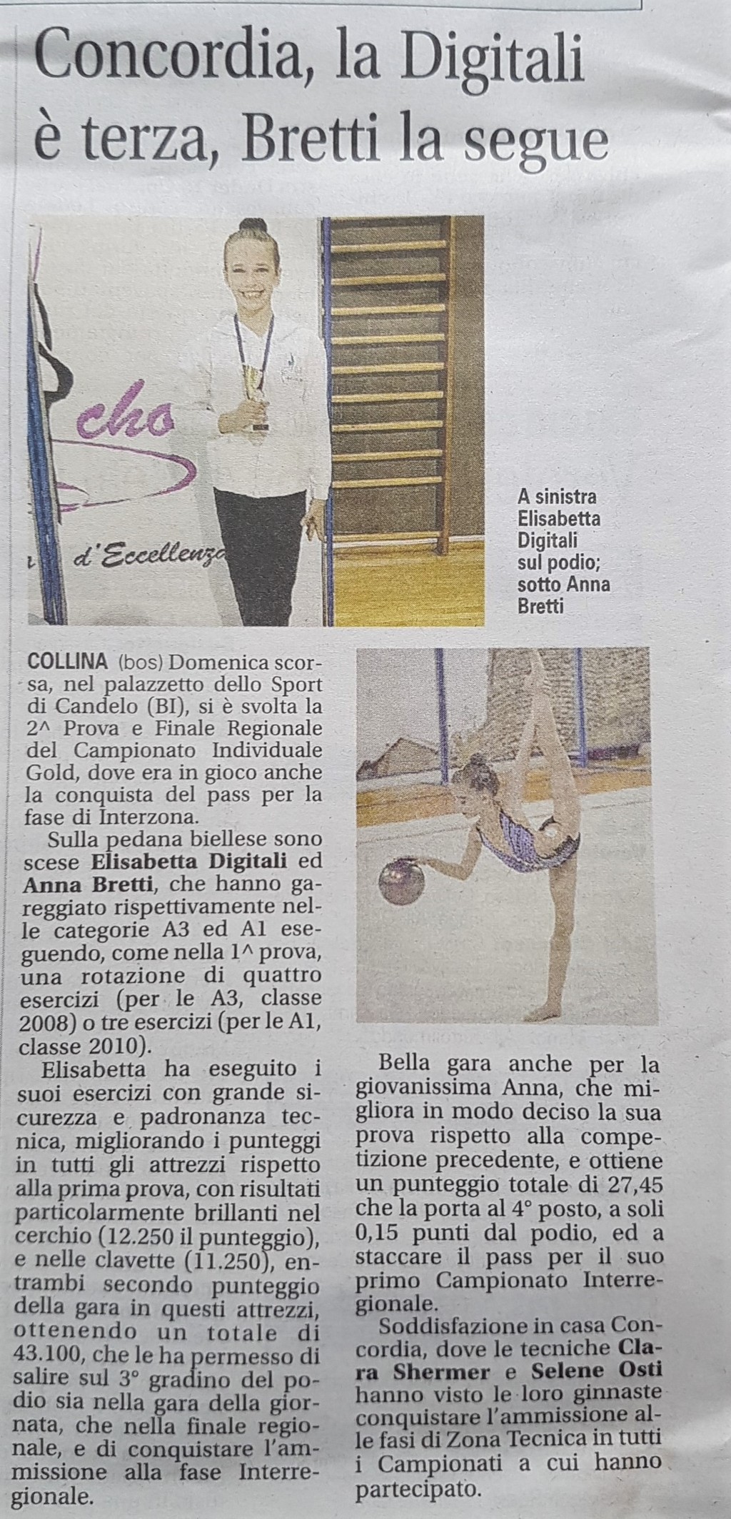 Sarà domenica prossima a Candelo, con l'organizzazione della Rhythmic School, la 2^ Prova e Finale Regionale del Campionato Individuale Gold. E sono pronte per scendere in pedana le nostre Anna Bretti, che gareggerà per le A1, ed Elisabetta Digitali, nella categoria A3. A bordo pedana, le tecniche Clara Shermer e Selene Osti. Forza Concordia! Siamo tutti con voi!