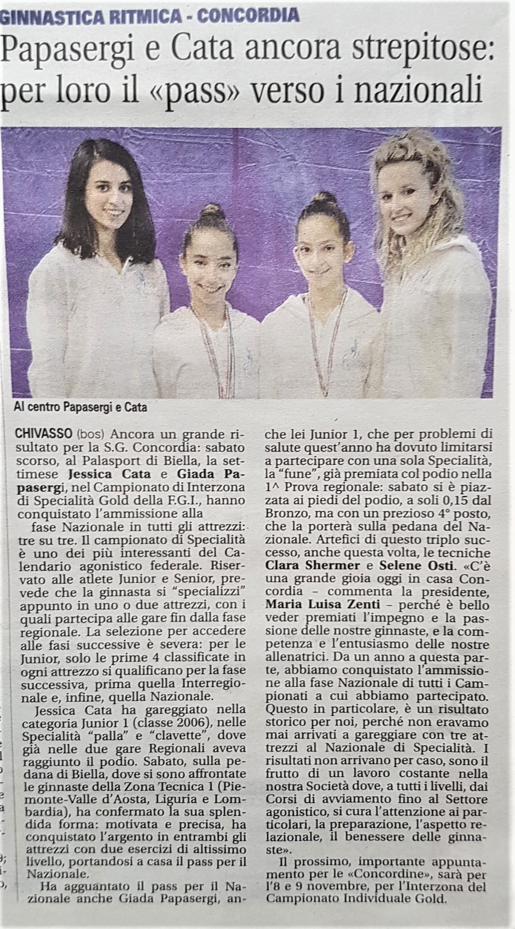 Siamo arrivati ad uno dei più importanti appuntamenti della stagione agonistica autunnale di ginnastica ritmica: in questo weekend, al Palalamarmora di Biella, si svolgerà la fase interregionale del Campionato di Specialità Gold. Sabato, per la Zona Tecnica 1, sulla pedana biellese scenderanno le ginnaste del Nord Ovest: Piemonte - Valle d'Aosta, Liguria e Lombardia. Domenica toccherà alle ginnaste del Nord-Est, con la Zona Tecnica 2. A difendere i colori del Piemonte, e della S.G. Concordia ci saranno GIADA PAPASERGI e JESSICA CATA, che gareggeranno nella categoria