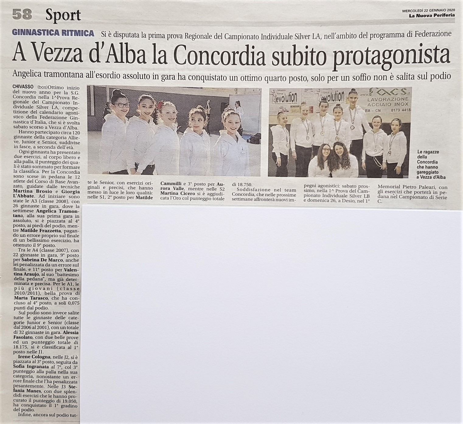 Procede ormai intensamente l’attività agonistica delle nostre ginnaste, che nel weekend scorso sono state impegnate su due pedane. Sabato, a Borgosesia, si è svolta la 1^ Prova Regionale del Campionato Individuale Silver Livello B, competizione del calendario agonistico della Federazione Ginnastica d’Italia, in cui hanno gareggiato circa 150 ginnaste delle categorie Allieve, Junior e Senior, suddivise in fasce, a seconda dell’età. Ogni ginnasta ha presentato due esercizi, il punteggio dei quali è stato sommato per formare la classifica. Per la S.G. Concordia sono scese in pedana Zoe Gamba, Beatrice Zanella, Lisa Roccati, Sofia De Angelis e