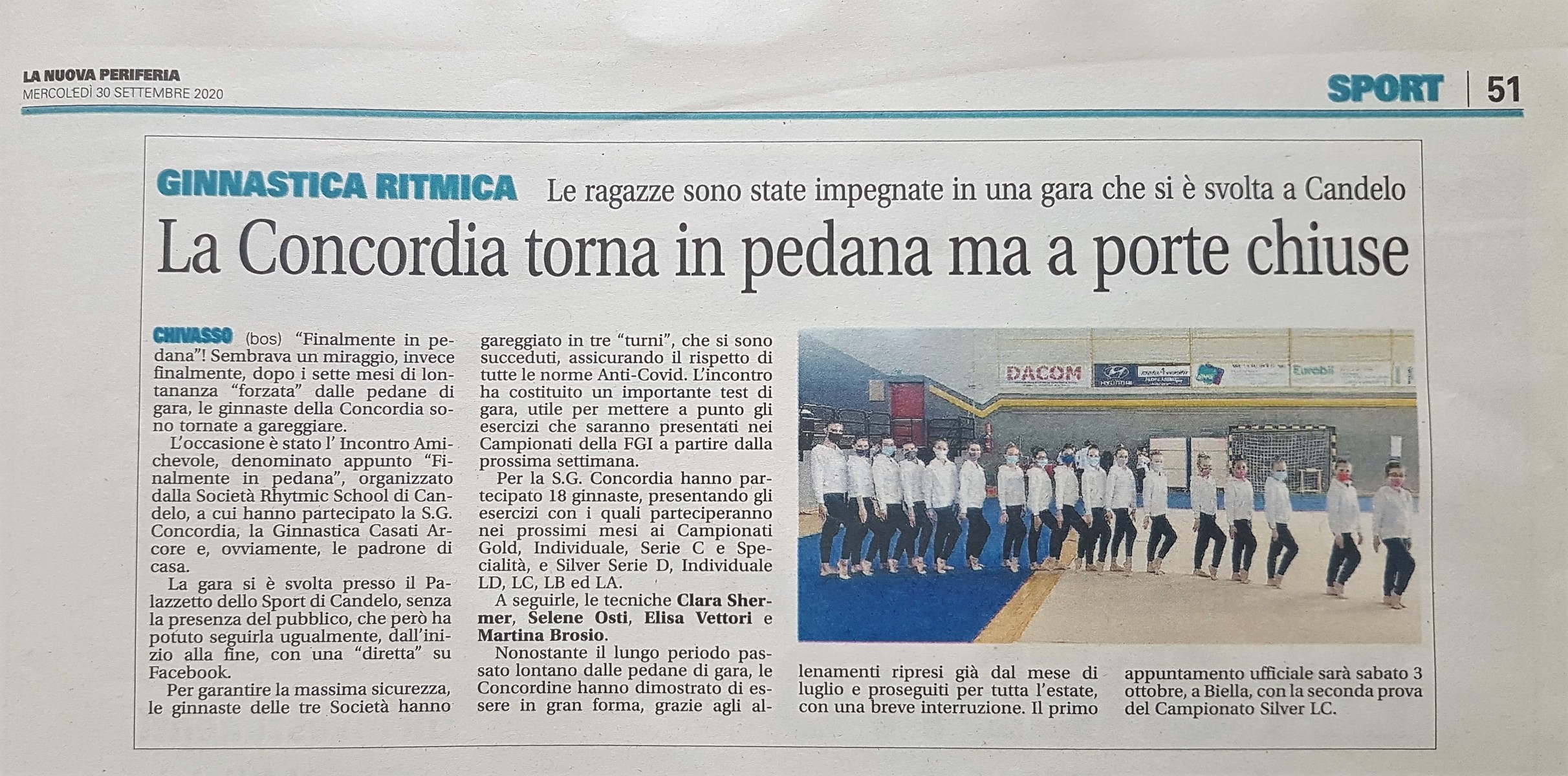 Le tribune sono vuote, manca il pubblico che applaude, ma il tifo delle compagne, forte e caldo, riempie ugualmente il Palazzetto di Candelo quando le ginnaste entrano in pedana, per la prima gara dopo il lockdown. Il Trofeo “Finalmente in pedana”, organizzato sabato scorso dalla Società Rhytmic School di Candelo, guidata da Tatiana Tshpilevaya, ha dato modo alle nostre atlete, insieme alle ginnaste della Società lombarda Casati Arcore e, ovviamente, alle padrone di casa, di provare di nuovo l’emozione di scendere in pedana, dopo i lunghi mesi di