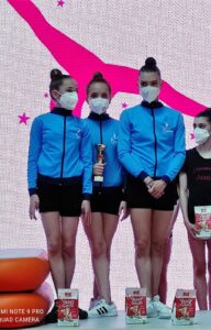 Ha iniziato la squadra della Serie D, Junior 2, nel Livello LE, il più elevato come difficoltà tecniche, formata da Caterina Perono, Giulia Maggio e Adele Cammilli: con la rotazione di tre esercizi (collettivo ai cerchi, successione cerchio e clavette, individuale con la palla) sono riuscite a conquistare uno splendido Bronzo, in una gara combattutissima fino all’ultimo minuto, che le ha viste lasciare dietro di sé squadre decisamente più esperte.