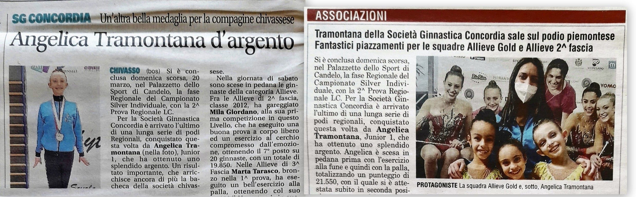 Oggi pomeriggio, nel Teatrino Civico di Chivasso, si è svolta l'edizione 2021 di "Omaggio allo sport", in cui l'Amministrazione Comunale ha premiato le atlete e gli atleti che nel 2021 hanno raggiunto traguardi importanti, conquistando Titoli Regionali e Titoli o Podi Nazionali. A ricevere il riconoscimento, per la Concordia sono salite sul palco le ginnaste Adele Cammilli Giulia Maggio Cecilia Bocco Sabrina De Marco Caterina Perono Biacchiardi Zoe Nicolini   Sofia Oliviero Aurora Bisoffi Valentina Araujo mentre Elisabetta Digitali, Jessica Cata, Giada Papasergi ed Aurora Sabattini non hanno potuto presenziare alla cerimonia perché impegnate negli ultimi allenamenti