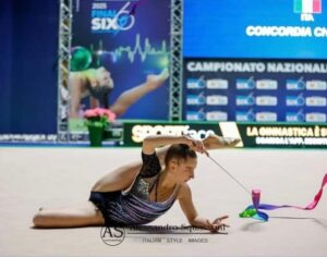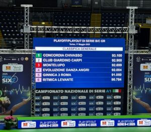 E infine, il nastro, tanto bello quanto insidioso: ed è la varesina Chloe Catena, con il suo esercizio elegante e sicuro che ottiene un bel 22.917, a compiere l’ultimo passo verso il podio: 93.100 il punteggio totale della Concordia.