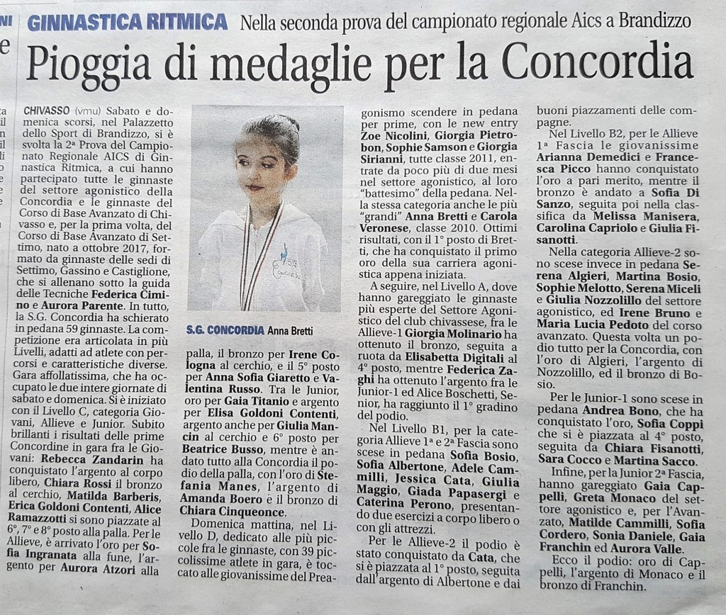 Pioggia fuori, ma pioggia di medaglie dentro il Palazzetto dello Sport di Brandizzo, dove sabato e domenica scorsi si è svolta la 2^ Prova del Campionato Regionale AICS di Ginnastica Ritmica, a cui hanno partecipato tutte le ginnaste del settore agonistico della Concordia e le ginnaste del Corso di Base Avanzato di Chivasso e, per la prima volta, del Corso di Base Avanzato di Settimo, nato a ottobre 2017, formato da ginnaste delle sedi di Settimo, Gassino e Castiglione, che si allenano sotto la guida delle Tecniche Federica