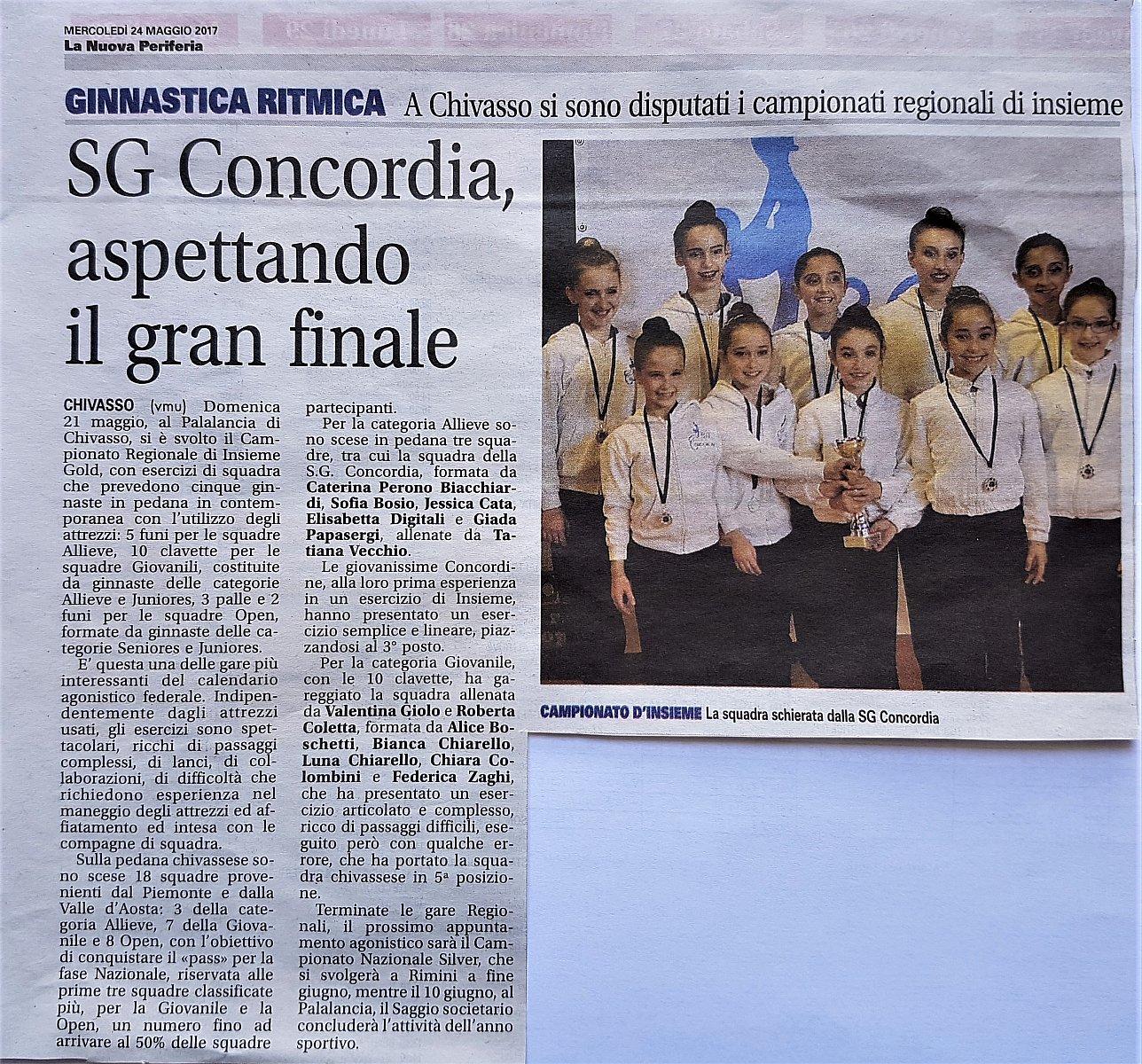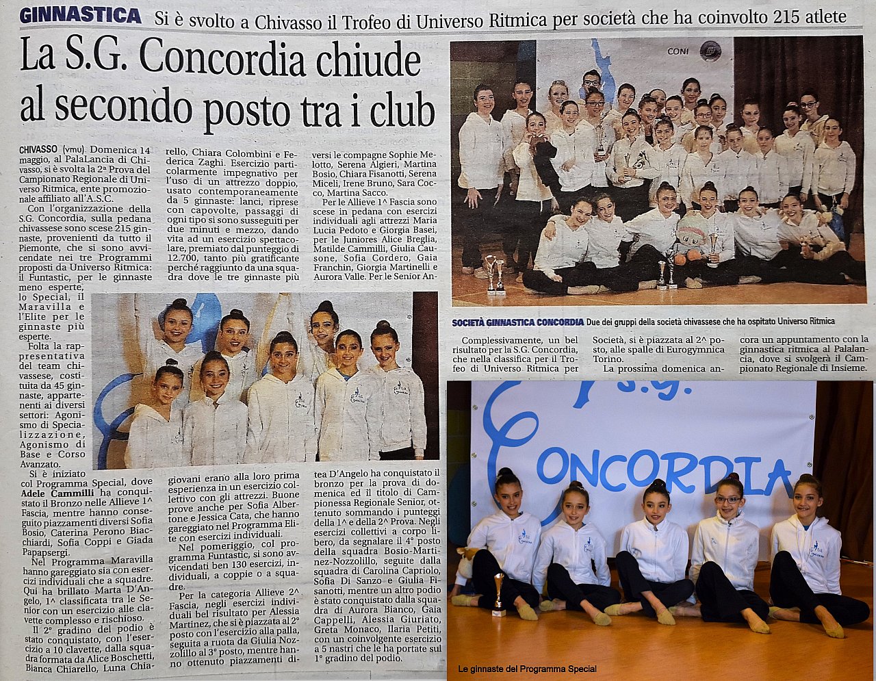 Domenica prossima, 21 maggio, al Palalancia di Chivasso si svolgerà il Campionato Regionale di Insieme, senza dubbio una delle gare più interessanti dell'anno. Diciotto squadre in pedana, per le categorie Allieve, Giovanile e Open. Due le squadre "concordine" in gara: nelle Allieve, saranno Sofia Bosio, Jessica Cata, Elisabetta Digitali, Giada Papasergi e Caterina Perono Biacchiardi a cimentarsi, per la prima volta nella loro ancora breve carriera agonistica, in un difficile esercizio di Insieme, con l'esercizio a 5 funi. Per la Giovanile, saranno invece Alice Boschetti, Bianca Chiarello, Luna Chiarello, Chiara Colombini e Federica Zaghi, a