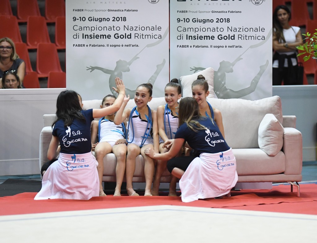 "Dammi il 5"! Perché ce l'abbiamo fatta, perché è andata bene, perché finalmente possiamo sorridere su questo bellissimo "Kiss & Cry"! Non è stato facile il cammino verso questi Nazionali di Insieme, ma Elisabetta, Giada, Giorgia, Jessica e Sofia hanno dimostrato di avere forza e carattere, hanno superato le difficoltà di questi ultime due settimane, e sono entrate sulla pedana di Fabriano decise a far bene. E così è stato. Un esercizio convinto, pulito, sicuro. Un punteggio di 8.800 che le ha portate al 18° posto su 32 squadre, alcune ben