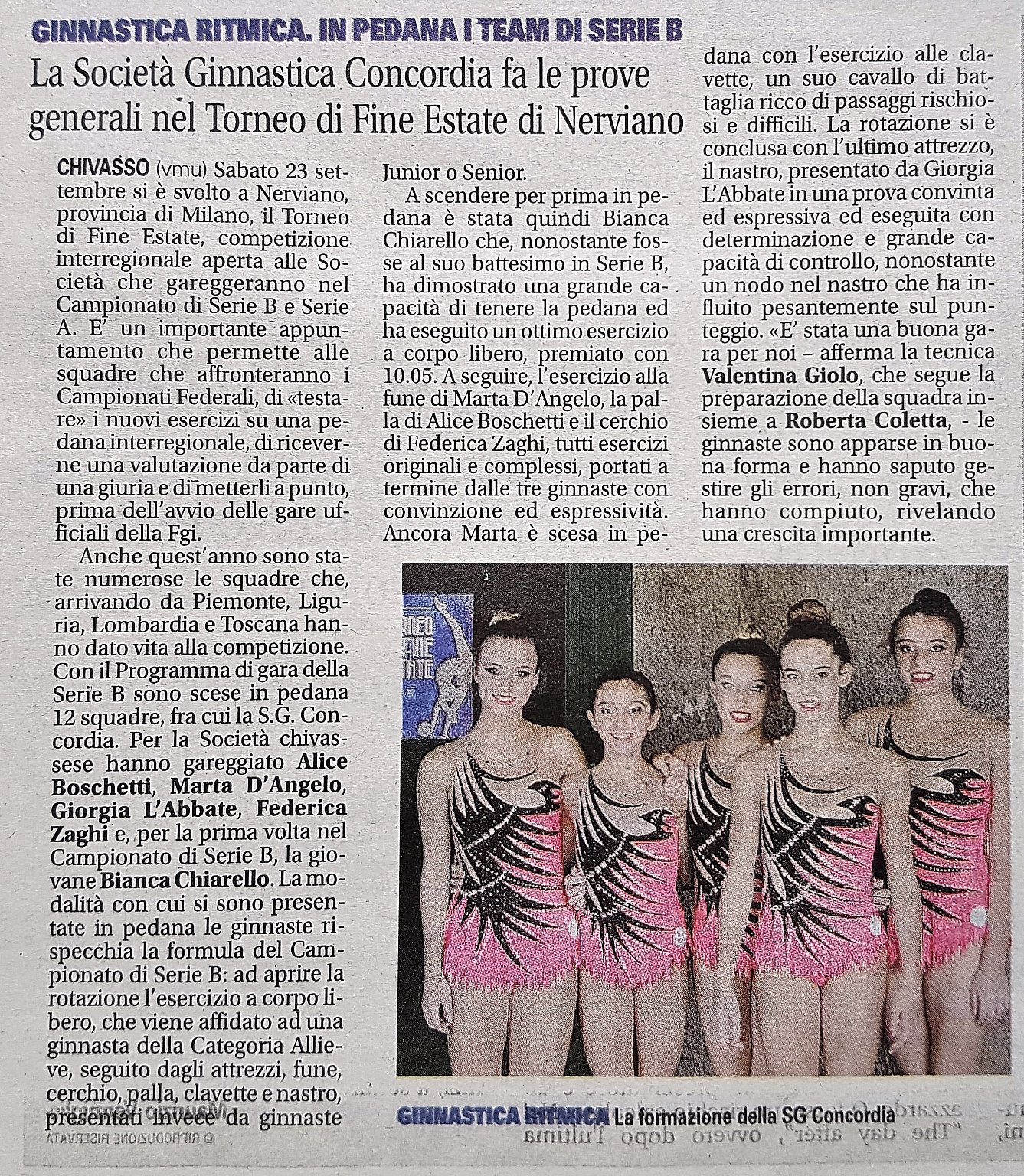 Sabato 23 settembre, a Nerviano, avrà luogo il consueto appuntamento di inizio autunno, dedicato alle squadre che parteciperanno al Campionato di Serie B. Per la S.G. Concordia scenderanno in pedana Bianca Chiarello al corpo libero, Marta D'Angelo alla fune ed alle clavette, Federica Zaghi al cerchio, Alice Boschetti alla palla e Giorgia L'Abbate al nastro.