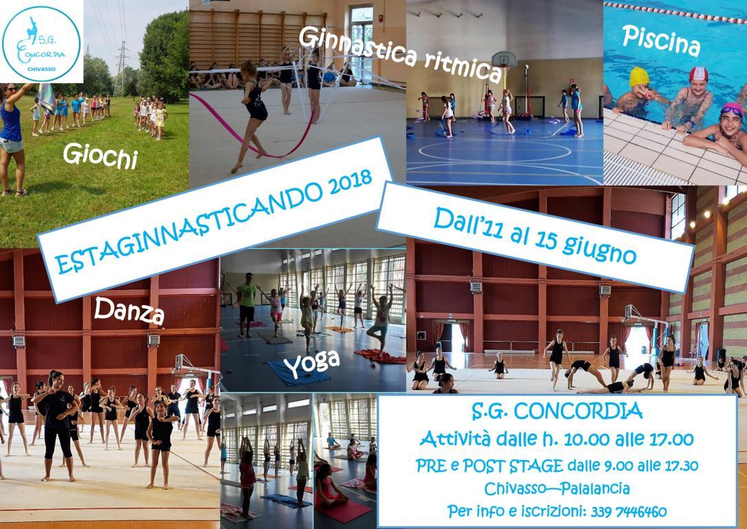 L’estate è ormai alle porte e, come ogni anno, la S.G. CONCORDIA vi propone di iniziarla insieme: dall’11 al 15 giugno si terrà il nostro consueto stage estivo, Estaginnasticando, che permette di trascorrere una piacevole settimana seguite dalle nostre vulcaniche allenatrici, pronte a proporvi attività coinvolgenti e appassionanti: ginnastica ritmica, ovviamente, e poi yoga, danze, giochi all’aperto, un giorno in piscina. Lo Stage è aperto sia alle iscritte ai nostri Corsi, sia a chi non ci conosce ancora ( ed è un’ ottima occasione per farlo!). Si svolgerà al