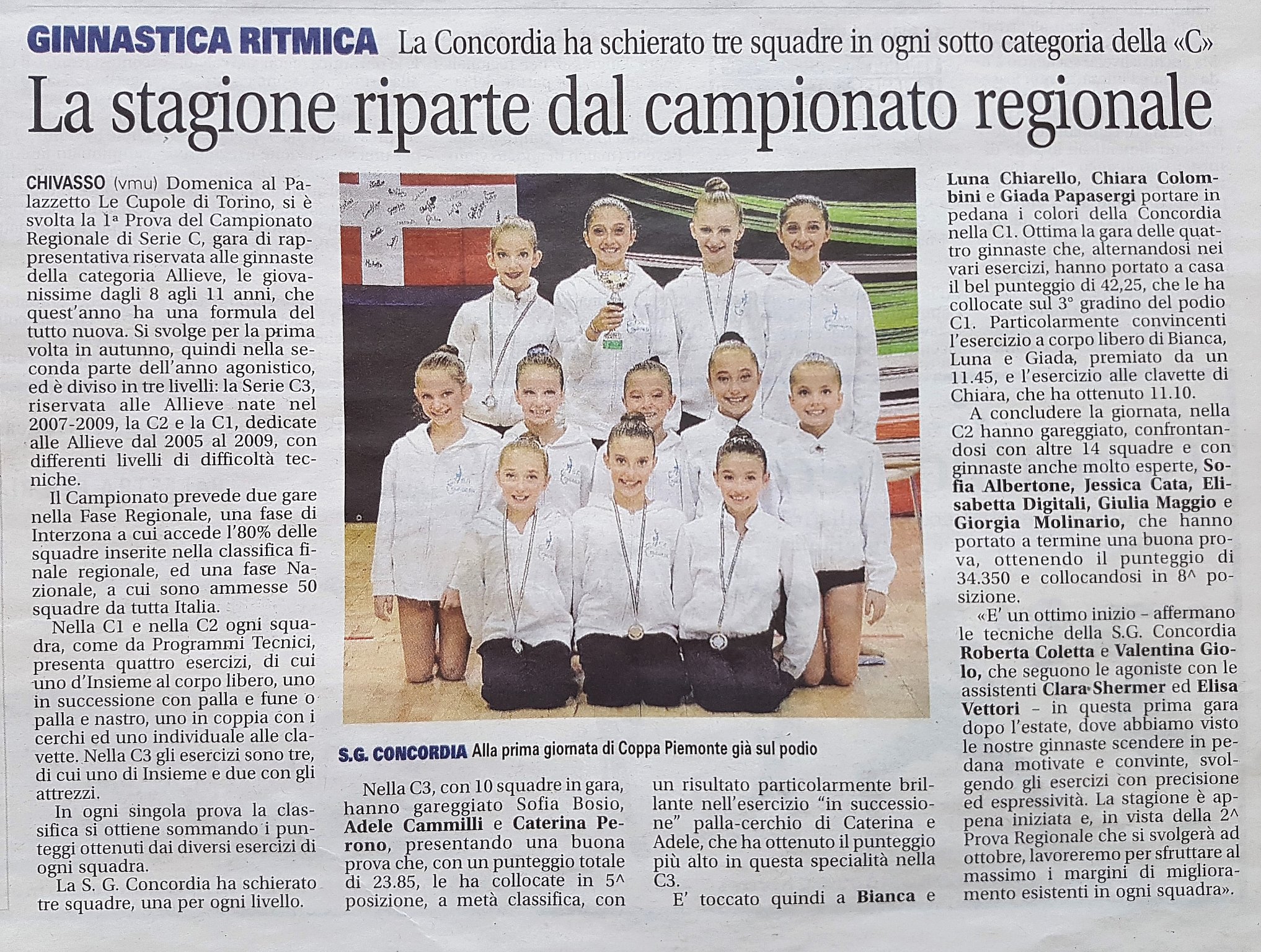 Sabato 23 settembre, a Nerviano, avrà luogo il consueto appuntamento di inizio autunno, dedicato alle squadre che parteciperanno al Campionato di Serie B. Per la S.G. Concordia scenderanno in pedana Bianca Chiarello al corpo libero, Marta D'Angelo alla fune ed alle clavette, Federica Zaghi al cerchio, Alice Boschetti alla palla e Giorgia L'Abbate al nastro.